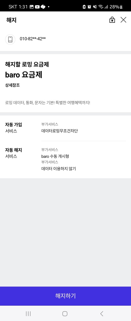 🎯 유심보호서비스 가입 시 'baro요금제(해외 로밍상품)'에 가입되어 있다면 해지 후 가입하기